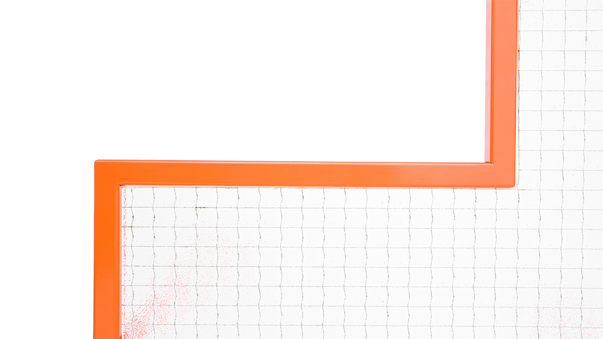 Estructura de hierro pintada en un llamativo color naranja, presenta formas rectas que simulan una elegante «L».